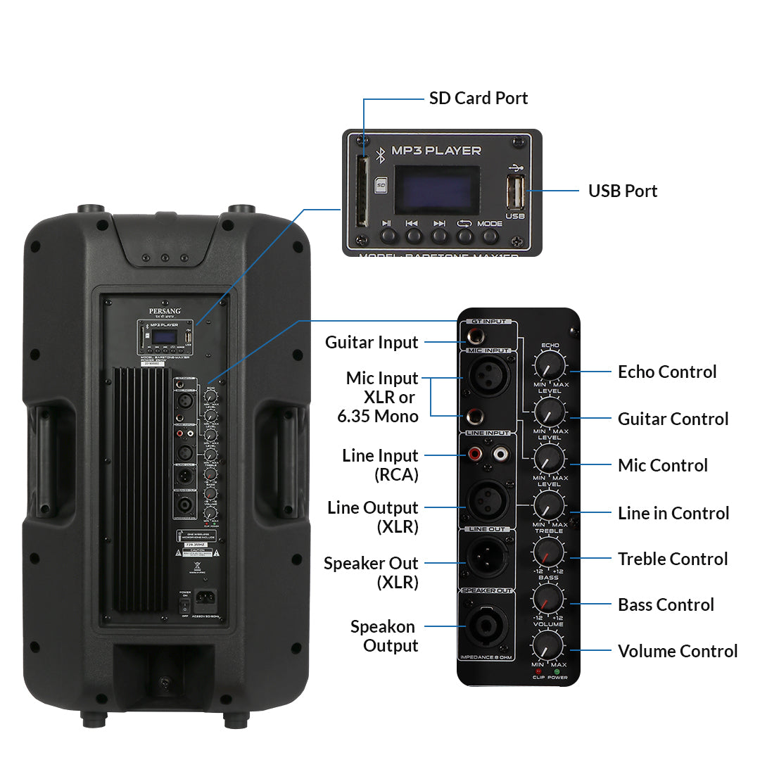 Baretone MAX 15R 15” 250W Active PA Speaker with DSP, Bluetooth, USB, SD Card, Dual Mic Support – Professional Sound System