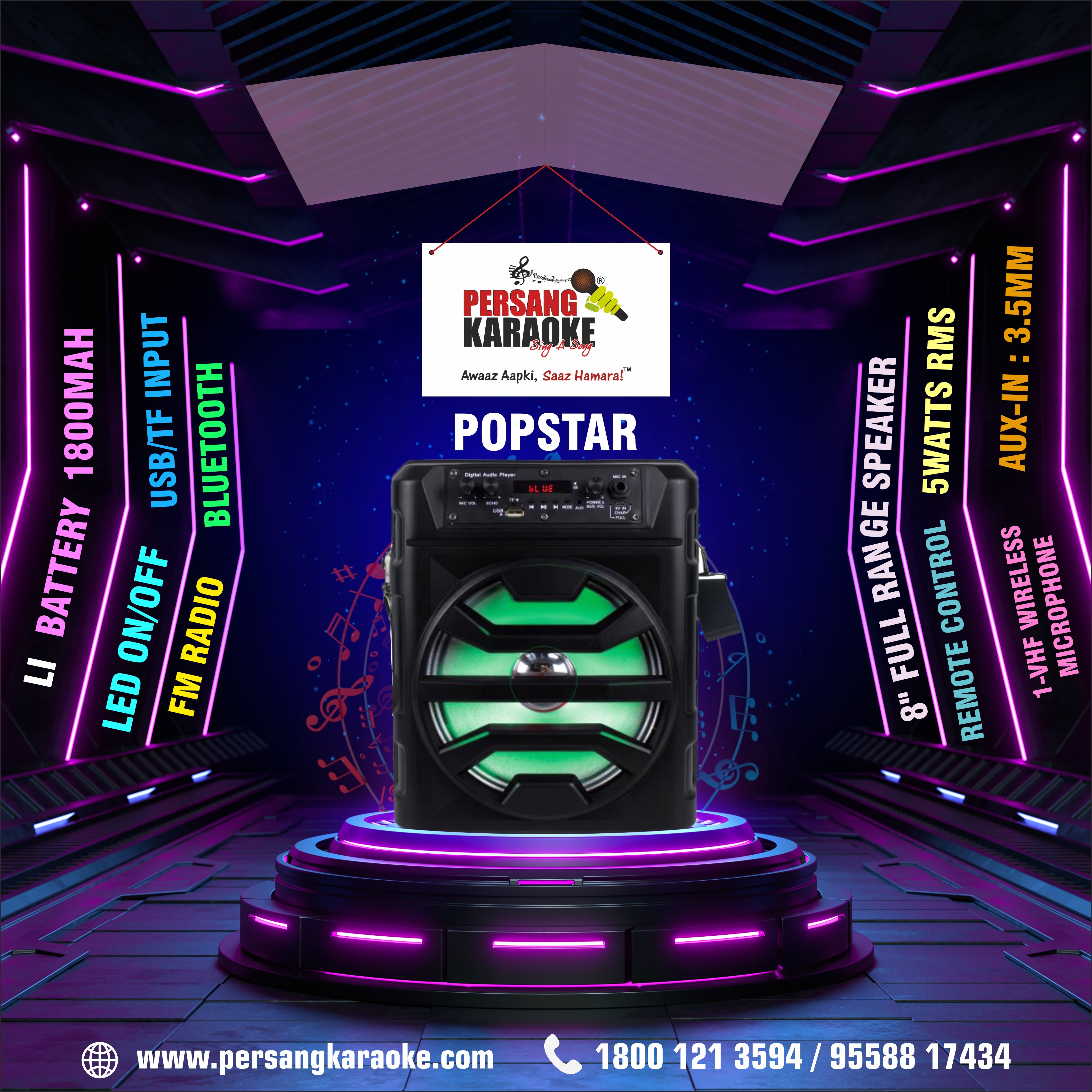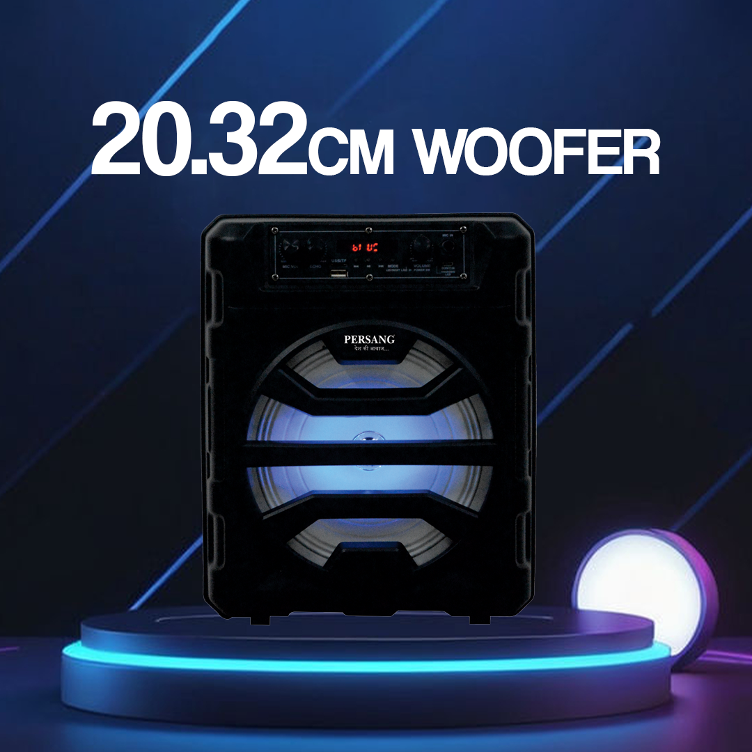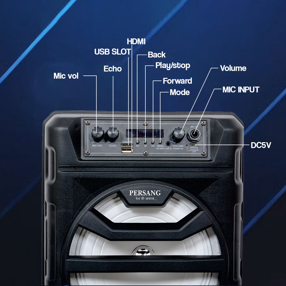 Power: 5 Watts Rms • 20.32 CM (8) Full Range Speaker • Li Battery 1800mAh • Led On-Off • USB-TF Input • FM Radio • Bluetooth • AUX-IN (3.5mm) • MIC input, Mic Vol, Echo • 1-VHF Wireless Microphone • Remote Control